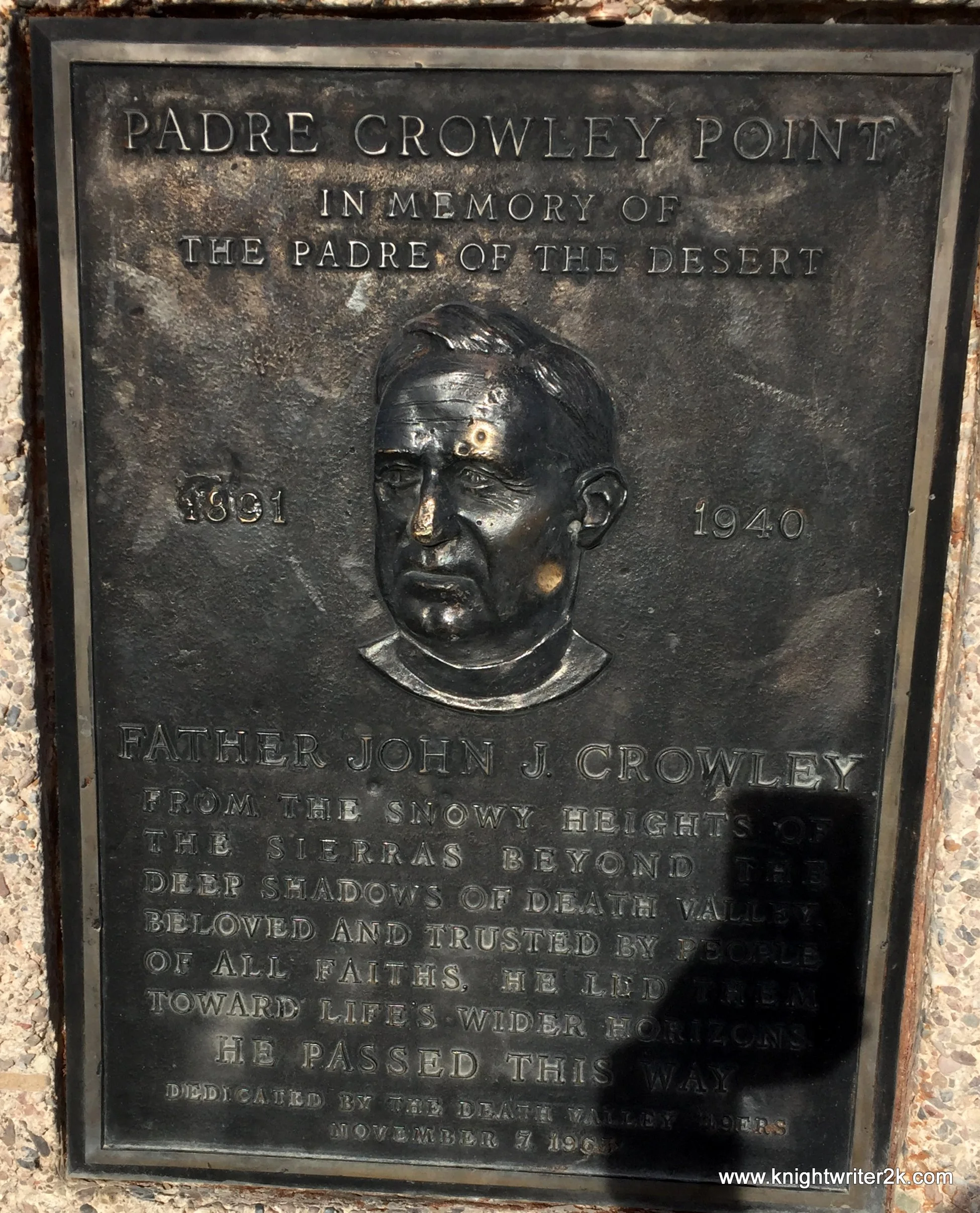 "Padre Crowley Point - In Memory of the Padre of the Desert 1891-1940. Father John J. Crowley. From the snowy heights of the Sierras beyond the deer (?) shadows of Death Valley beloved and trusted by people of all faiths , he led them toward life's wider horizons.  He passed this way. Dedicated by the Death Valley 49ers November 7, 1968.